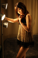 ランジェリーっぽく見えてくつろいだ感じの作品が撮れました。続いてガラリと雰囲気が変わり豹柄のキャミソールで登場。照明を落として白熱球