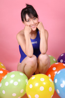 バルコニーと窓際でたっぷり自然光を浴びながら撮影しました。次はブルーの競泳水着に着替えてピンクのバック紙で撮影。カラフルな風船を