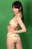 グリーンのボーダー柄のビキニで登場。ハート柄の風船を入れてグアビア撮影を行いました。最後はグリーンのバック紙を使ってリゾート風の