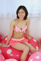 なイメージが萌ちゃんにピッタリでした。その後トップスを脱いでビキニ姿を披露。ハート柄の風船に囲まれて楽しい雰囲気で撮影しました。