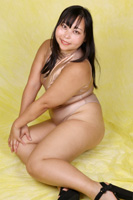 ピンクゴールドのレオタードで登場。イエローバックを背景にキュート&セクシーな魅力をたっぷり撮影しました。オフ会は久々に